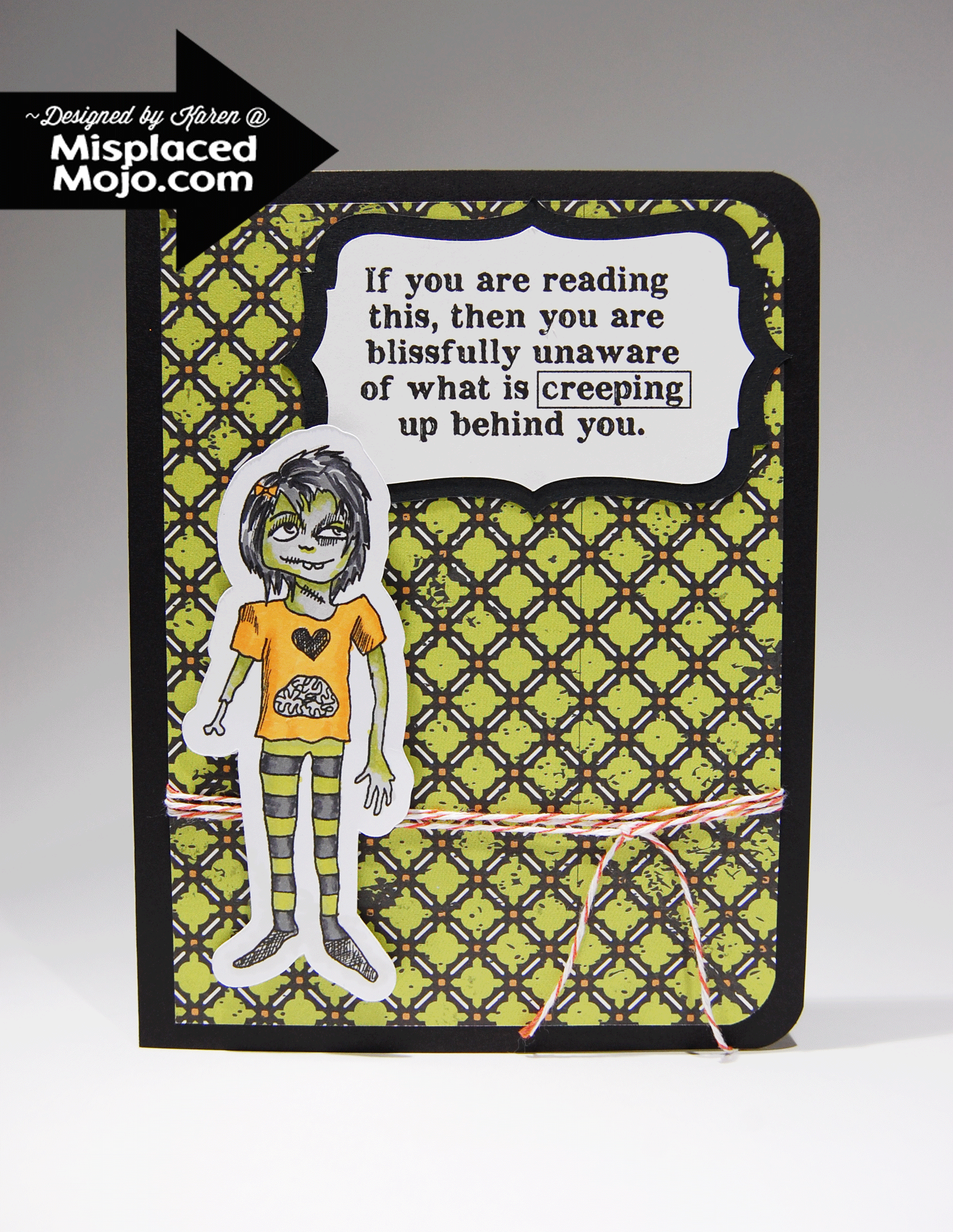 The cute little zombie is from Wonderstrange, a quirky site with a ton of free digis, though you must have a full appreciation of things wondrous and strange to enjoy them!  Put it this way… this zombie is pretty normal and tame for them!  But, I love zombies (and zombies love brains) and even a brain loving zombie would like this card 😉  This image was imported into the Silhouette software so I could do a Print & Cut, which allows me to either cut on the outside line of the image, or to any size “shadow” of the image.  Then she was colored with Promarkers and popped up on foam tape.  So fun to do zombie skin in gray and green!  The fitting sentiment on the front is from Create with TLC and was cut with the 4 Halloween Labels from the Silhouette Store.  The paper is from Echo Park’s Chillingsworth Manor 6×6 pad and wrapped with orange twine.  Inside I used a simple Heidi Swapp rub on and a freebie sentiment from ArtiCrafty by Rebecca.   A quick rounding of 2 of the corners, and that completed the card and my Halloween craft-a-thon!