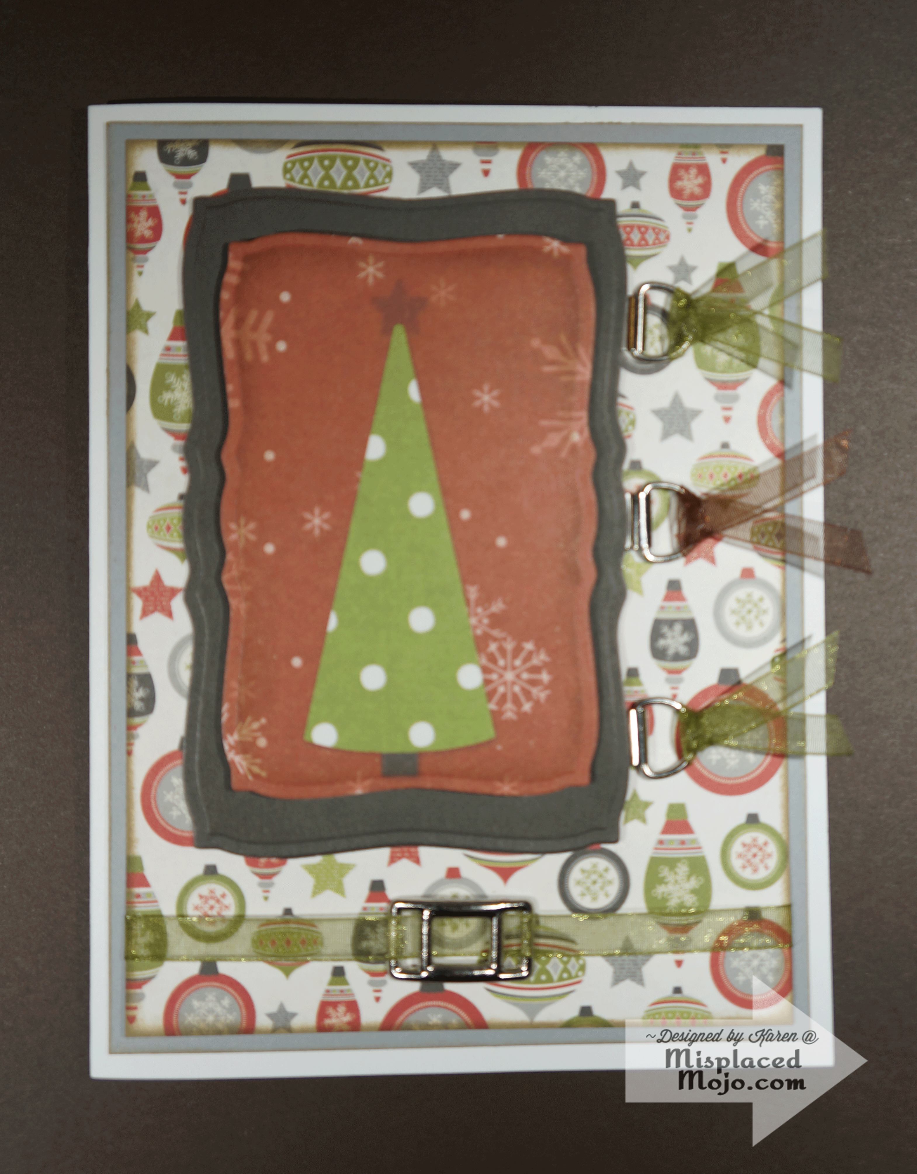 The focal was from a 12×12 sheet of 3×4 double sided focal images by Simple Stories. I know she loves the rich colors of burgundy and olive, so I added a rich dark brown and a subtle gray to the mix with patterned paper from the ‘Tis the Season 6×6 pad by Echo Park. The focal and its mat were cut and embossed with Spellbinders Curved Rectangles dies. The focal, sentiment, mats and all the patterned paper were inked ever so lightly with Memento Rich Cocoa ink. I love the stencil technique you can do with Spellbinders dies! The focal and sentiment were popped up on foam tape for dimension. The ribbon slide and and loops were from a hardware pack sold by Oriental Trading Company. The organza ribbon in brown and olive added the final touch. Here’s another look at the details: