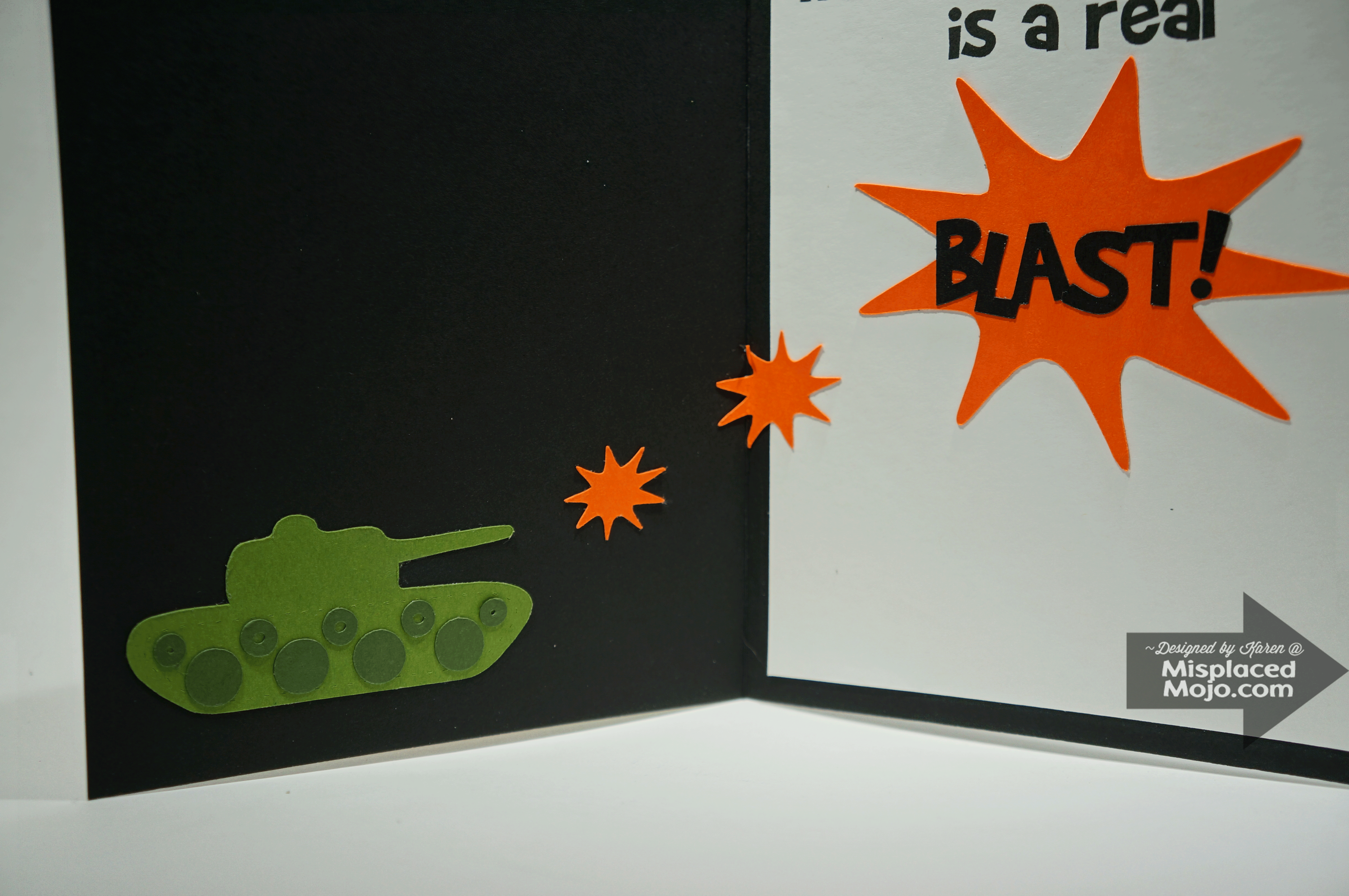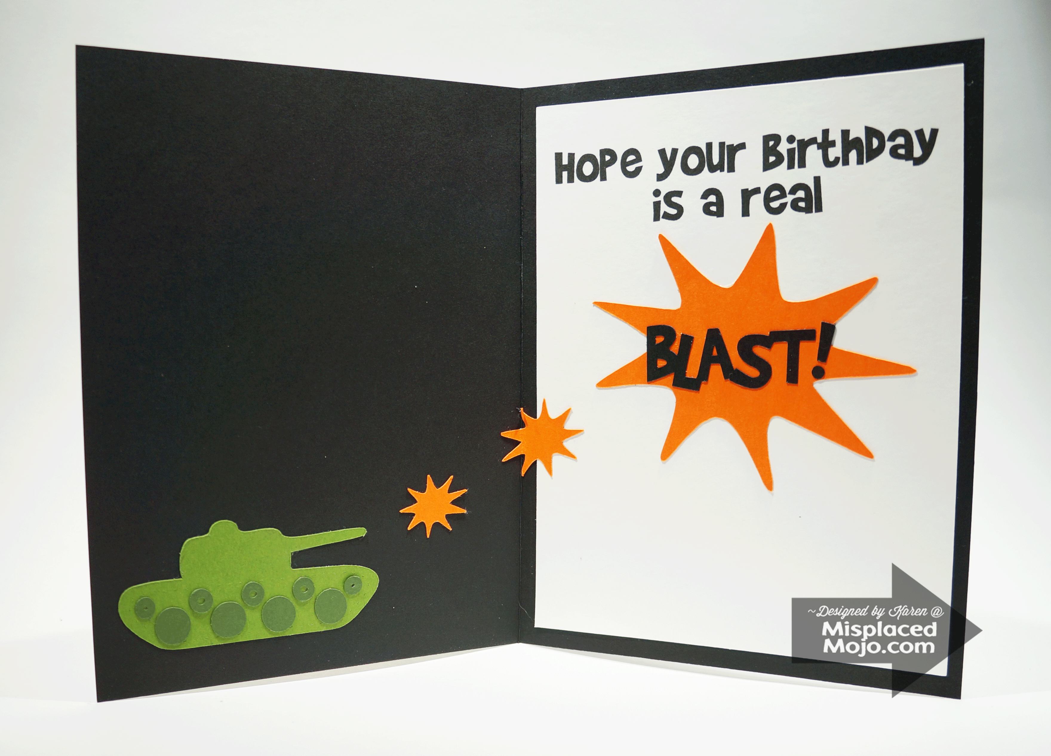 OK, so my son is attending a birthday party for a 13 year old at a place called Tanktown where they will get to ride in a real tank and watch the tank crush a car, ride in a military Humvee, and then play paintball. I knew I would have to match the card to the theme once I heard all about it! To make the 3 blast sentiments on the front I had to modify the sketch to some degree. Hopefully it’s close enough! The orange blasts and black and white base tie in nicely with the photo (thanks Sharon for the color input!). The tank and blast die cuts were from the Silhouette store, though I changed the font of the words. I also tilted the letters the way I liked them and welded them together to make gluing easier. Here’s a peek at the inside: