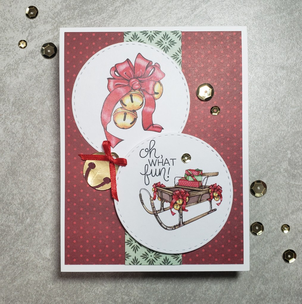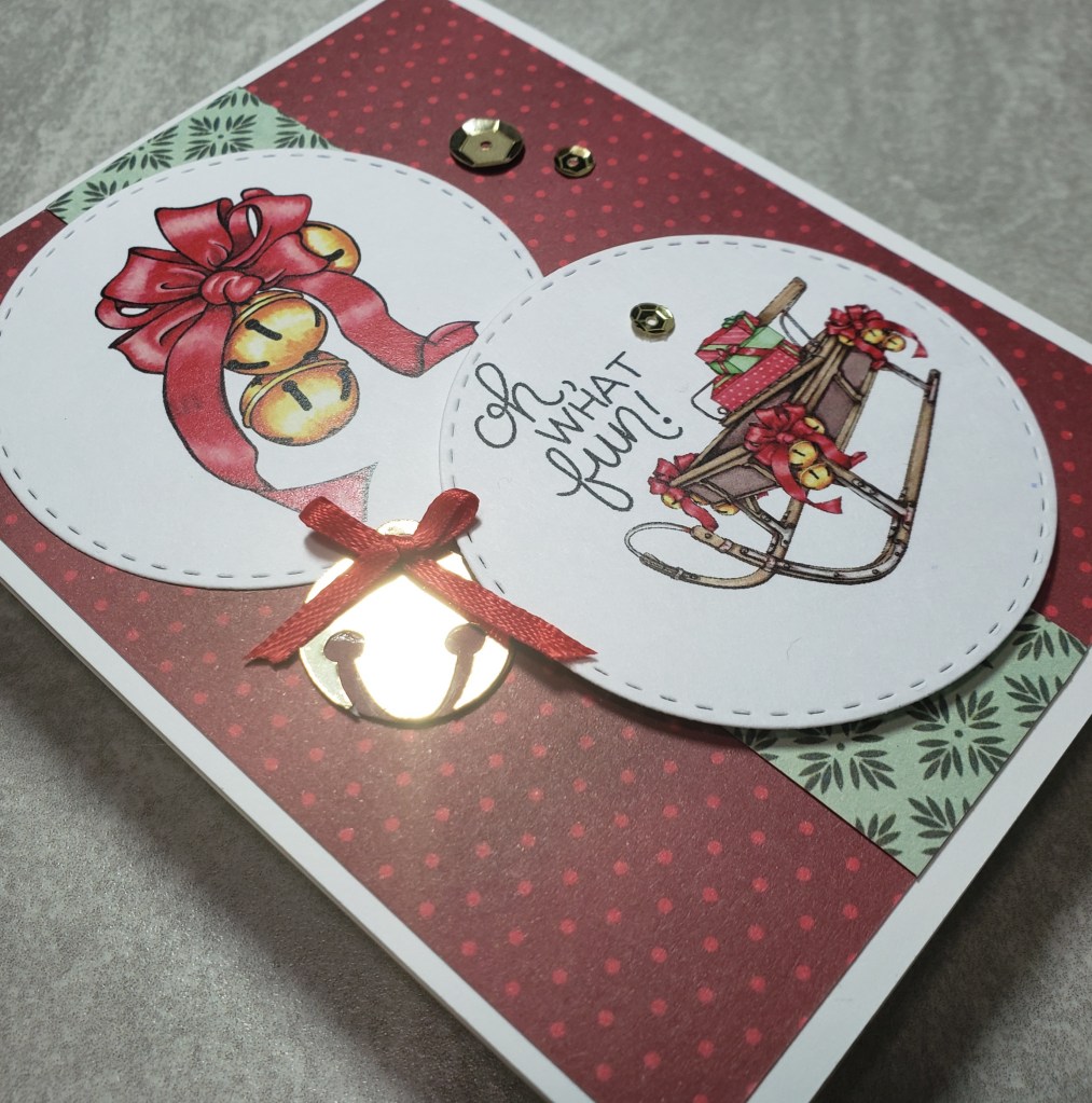 After printing, I die cut the images with a stitched circle die. With just 1 sheet of 6×6 paper, I was able to cut the 4″x 5.25″ card front, use half of the remainder as an accent piece on the front, and used the remainder on the inside as a decorative element to tie the inside to the front. I love double sided paper!!! And it was serendipity that both sides coordinated with the precolored images! I had a small sentiment stamp from a Hello Bluebird set that fit perfectly. Using a small, gold, mirror cardstock scrap, I die cut a jingle bell as an embellishment and gave it a red bow to match. A little foam tape and a small sprinkling of sequins to add more metallic gold to the card, and this card was done! This one came together in record time for me!!! And *that* is why Jan’s sets rock… you have line images, pre-colored images, accessory images, and sentiments to choose from or to mix and match with items in your stash. The possibilities are endless! So much versatility! Here’s another view of the card showing the shine of that mirror cardstock and the dimension of the layers: