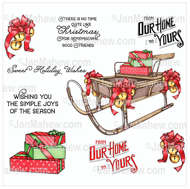 Now I know that Christmas already passed us by, but at the end there, some of us were panicking a bit because we hadn’t made enough in time. I don’t want that to happen to me ever again, so I make a point to make at least 1 or 2 Christmas cards a month all year long. It helps that Christmas images are some of my favorite to play with!!! For this card, I used the gorgeous pre-colored images in the Holiday Sleigh set. Take a quick peek at everything you get in this set: