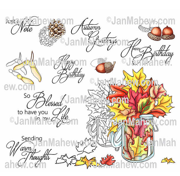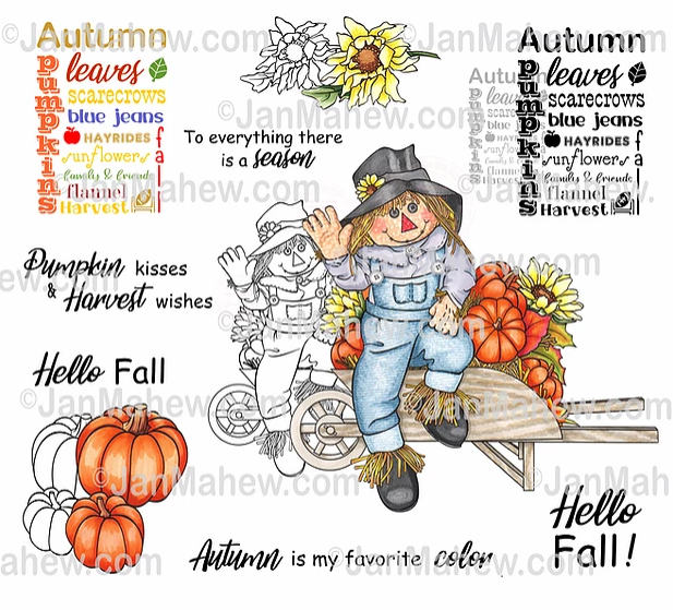 Today I am sharing a card made with an older set from Jan’s Digi Stamps called Harvest Scarecrow. I knew one day I would want to color up this little flower image and this was the perfect time! I previously used this set once before in an October 2020 post, if you would like to see another take on the set. For today’s card, I also used a sentiment from another versatile JDS set called Signs of Autumn, which has so many beautiful, year round sentiments. Take a look at what comes in each set:
