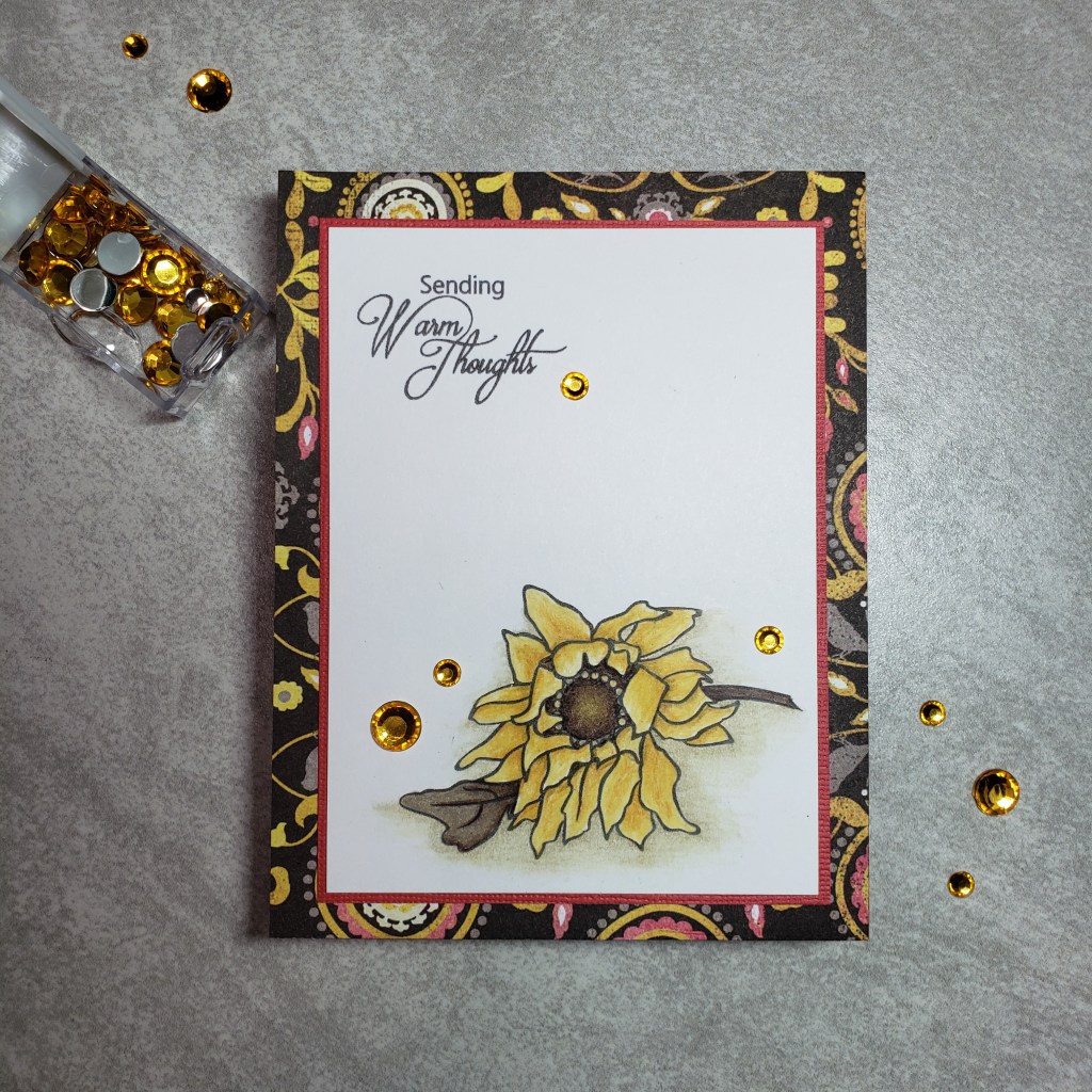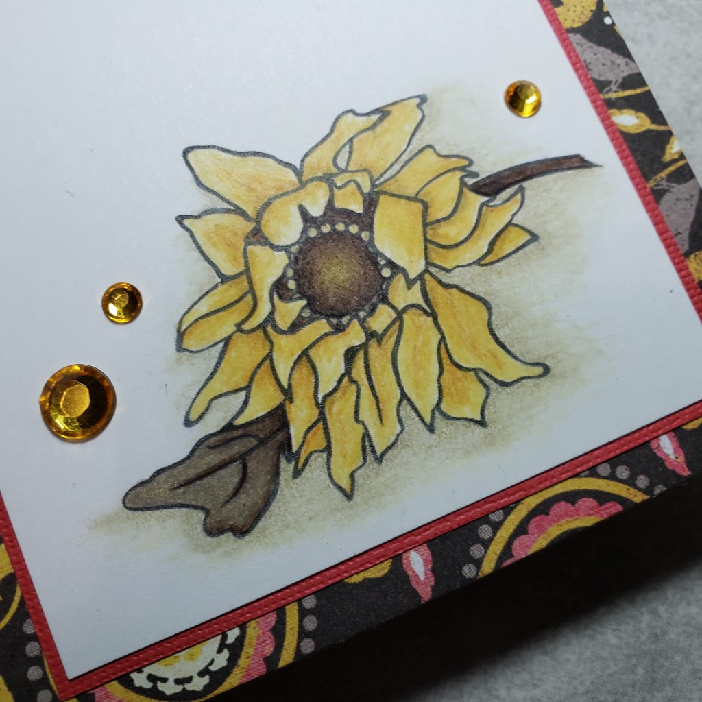 I used my Silhouette software to arrange the flower and sentiment to create a card front panel. Initially I was going to go completely CAS and make the white panel the full card front. But then I tripped over some old Authentique paper and fell in love with this pattern. The dot pattern around the flowers in the paper mimicked the flower center in the digi stamp. I printed the card panel on Bristol paper, and colored it with Prismacolor pencils that matched the paper. Then, I cut the panel down so some of that patterned paper would show but I created a thin mat for the focal panel in red to tie into the color palette on the patterned paper. I finished the card with a trio of rhinestones, and now I have an any-time-of-year thinking of you card! While everyone else is dreaming of spring, I was inspired to use a couple autumn sets for a non-autumn card!!! Leave it to my mojo to be totally out of season 🙄 Here is a close up picture of the colored image: