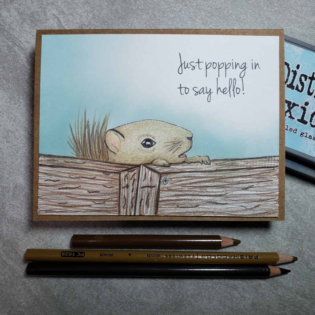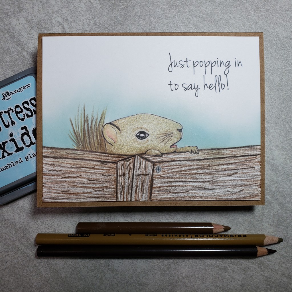 I used the software for my Silhouette Cameo to create the layout of the image and a sentiment I made myself that does not come with the image. I also created a 2nd panel to continue the sentiment on the inside of the card. After printing and cutting the panels down to fit an A2 card, I colored the image with Prismacolor pencils. There was so much white space that it felt like it needed something so I printed the layout again on copy paper and fussy cut the image out to use as a mask. I covered the squirrel and fence, then ink blended Distress Oxide ink in Tumbled Glass with a makeup brush over the mask and onto the panel to create the look of sky in the scene.