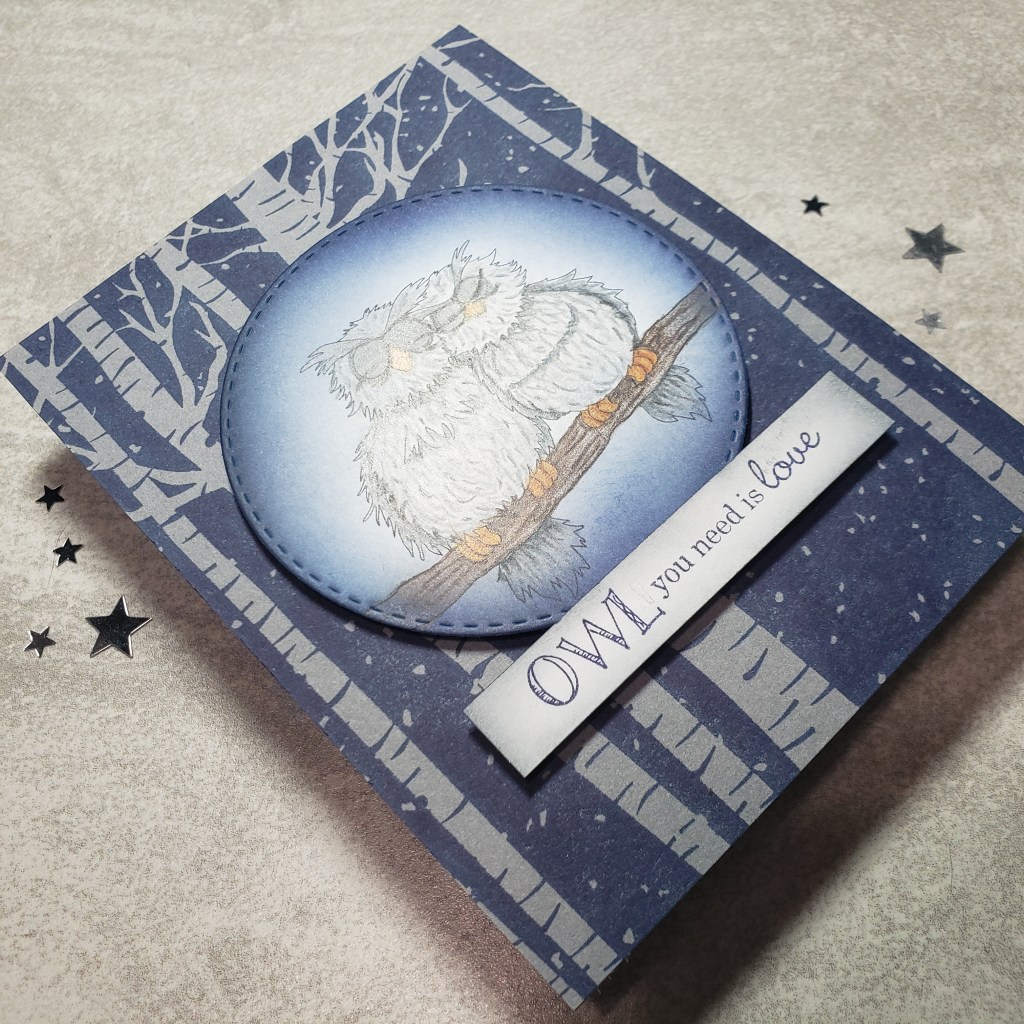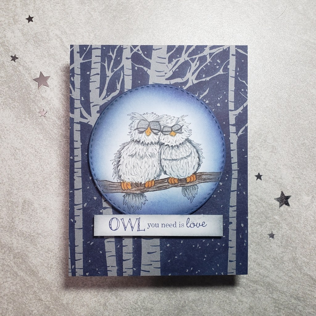 This month’s challenge at 2 Crafty Critter Crazies is sponsored by Beccy’s Place. Beccy has some amazing sets on her store site but she also has a ton of freebies on her blog! For my card, I opted to use a free digi called Owl Love, which comes in both b/w and color, and with and without a sentiment. I used the b/w version without a sentiment as I had a plan for an alternate sentiment using stamps in my stash. To create the card I first printed the image, die cut it with a stitched circle die, and colored it up using Prismacolor pencils. I knew I wanted a blue/gray color combo, so I made the owls gray. I made the background next, using products from Impression Obsession… I used their Navy Hybrid ink on a background stamp called Birch Trees stamped on a gray heavy weight card base. I used the same ink to blend the edges of the focal point. The navy ink wasn’t as dark on the white paper as it was on the gray, so to make it match I added some Chipped Sapphire Distress Oxide ink to darken the edges.