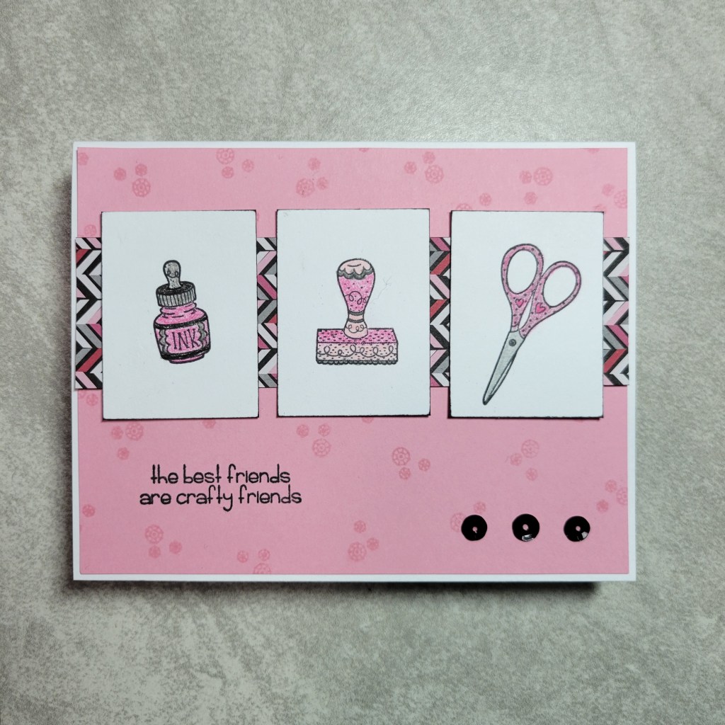 This one uses an older than dirt Pink and Main set aptly named Crafty. Same idea and orientation as the last one, but I used a tiny sequin stamp in the set with a pale pink ink to make a tone on tone pattern in the background. And of course since I used the sequin stamp, I had to use sequins for the embellishments too. The scrap used on this card was from a masculine valentine’s card from probably 8 years ago and I love that chevron! Because it was so busy though, I inked the edges of the focal image panels to finish it off. And because this stamp set has so many fun images, I decided to whip up another quick card with it: