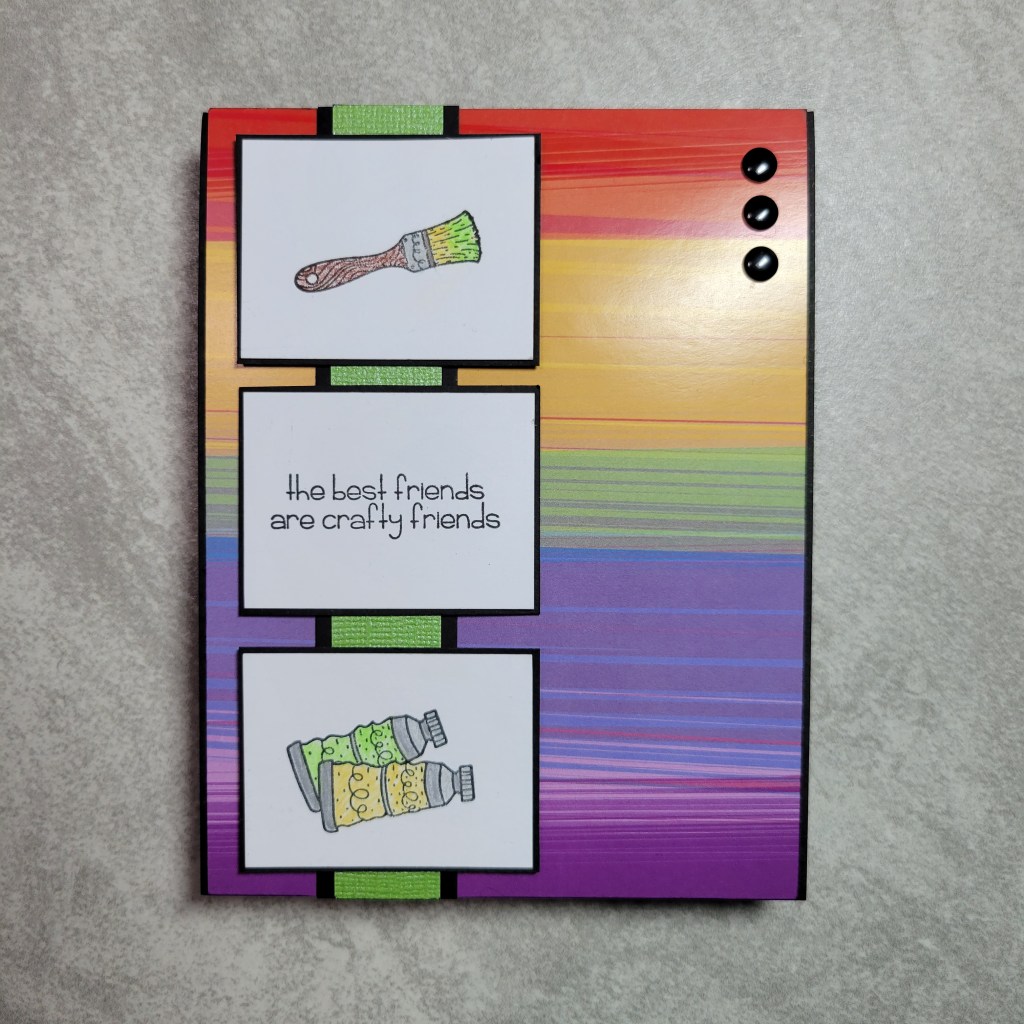 This last friendship card uses a printed paper from an old (and now defunct) Inkspired monthly kit. I knew I wanted to use the paint tubes and paintbrush in the set, and I immediately remembered this paper which looked like paint strokes to me. In no time I had the images colored up, and to add some contrast to the rainbow colors I matted all the elements and the panel in black and used black epoxy dots for the embellishments. I liked the idea of placing the sentiment in one of the rectangular elements for something different! And you’ll notice I didn’t rotate the sketch this time; this one was the literal translation of the sketch.