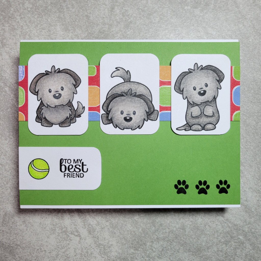 Those pups are too darn cute! The 2 cards you made with the Crafty set are great too: my favorite being the one with the rainbow paper. Rainbow always looks great with black! I’m glad Mr. Oliver didn’t get away with eating your colored pencils! 🙂